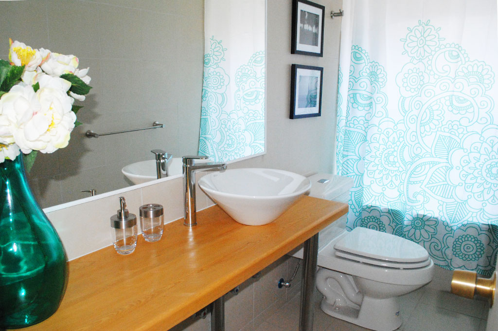 Cocina amoblada con muebles de melamina cubierta granito, lavaplato y campana.